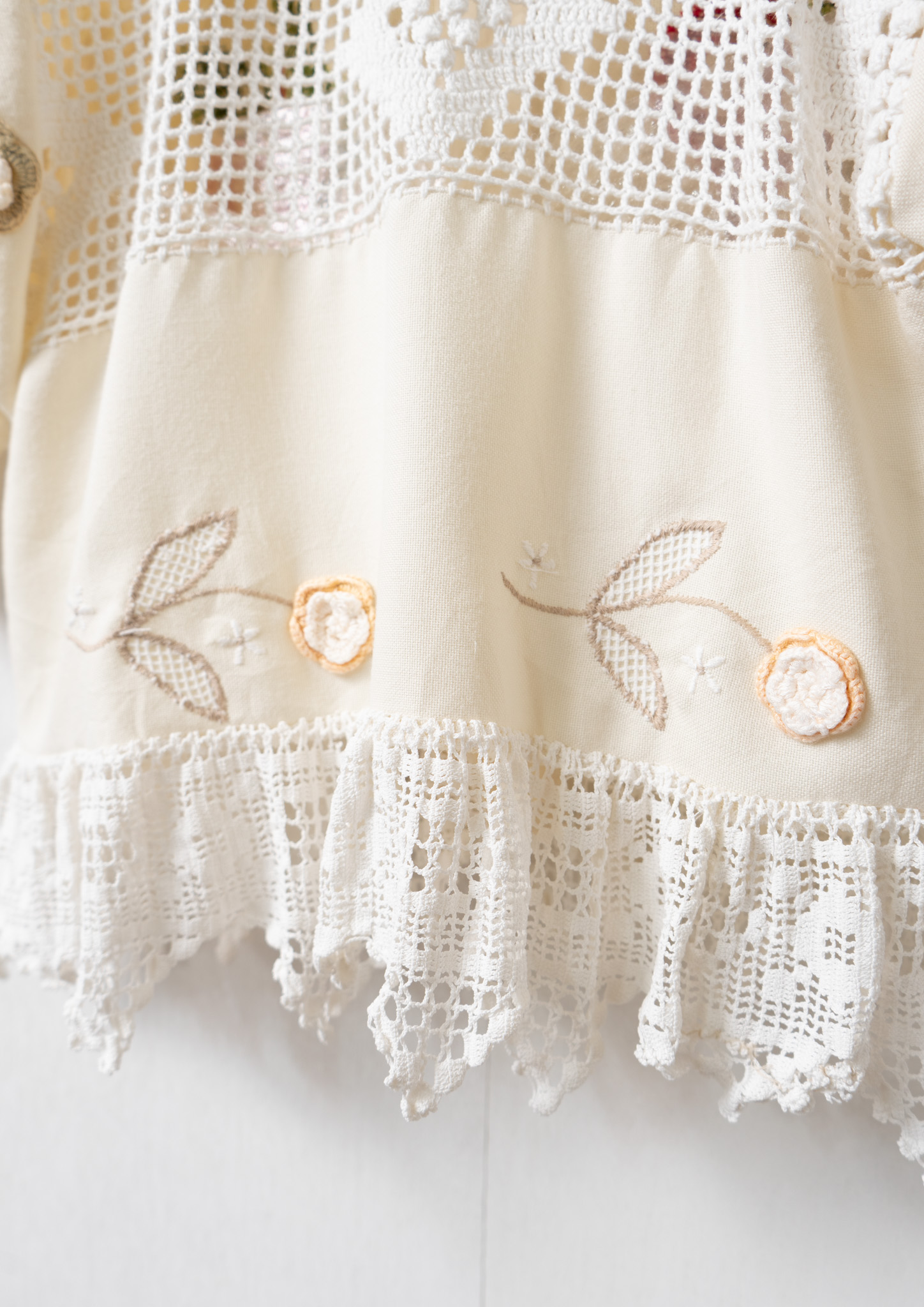 Upcycle Bird × Flower Embroidery Lace Collar White Blouse