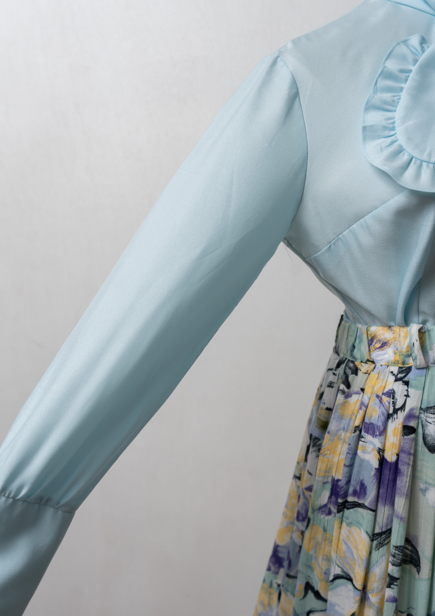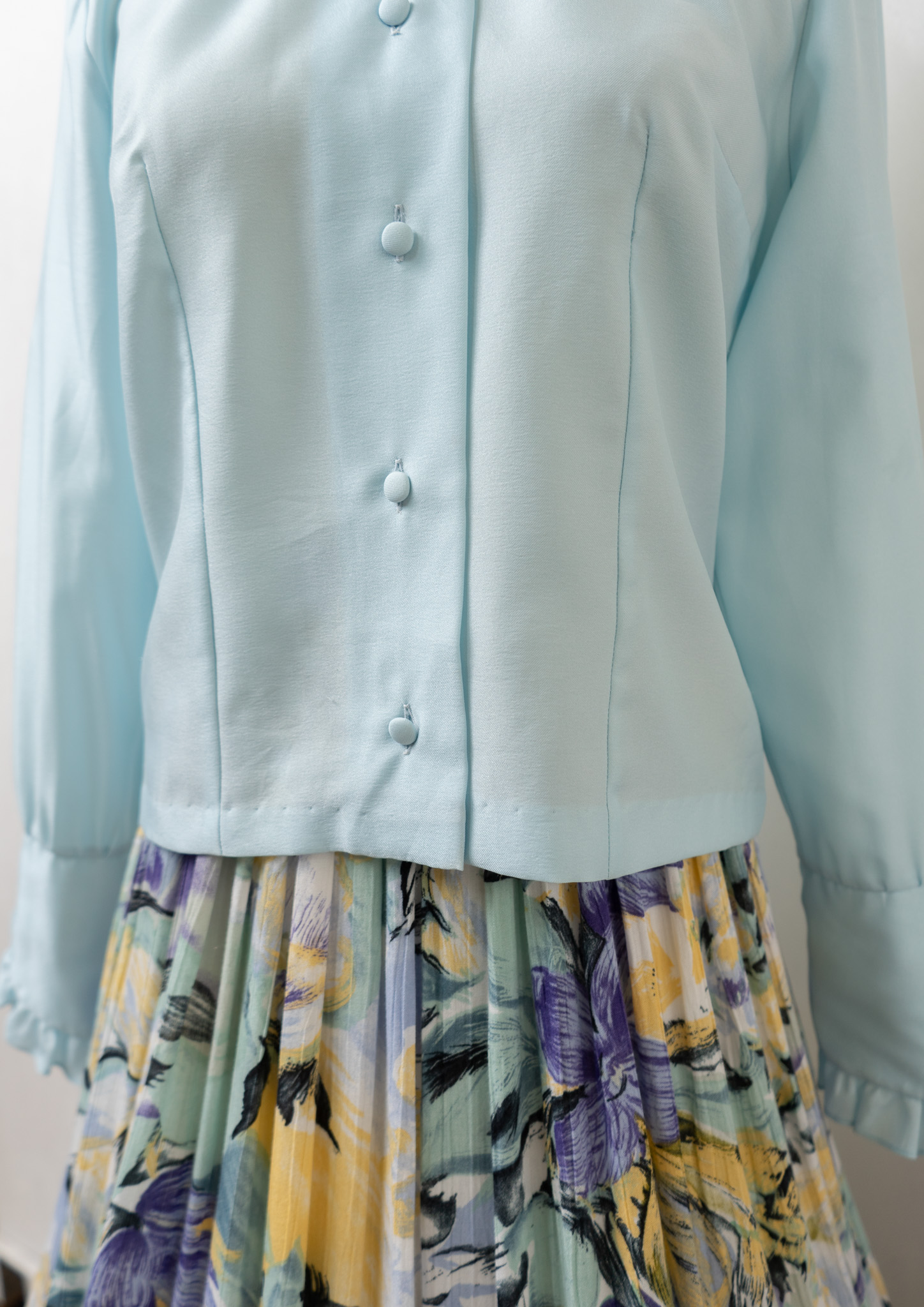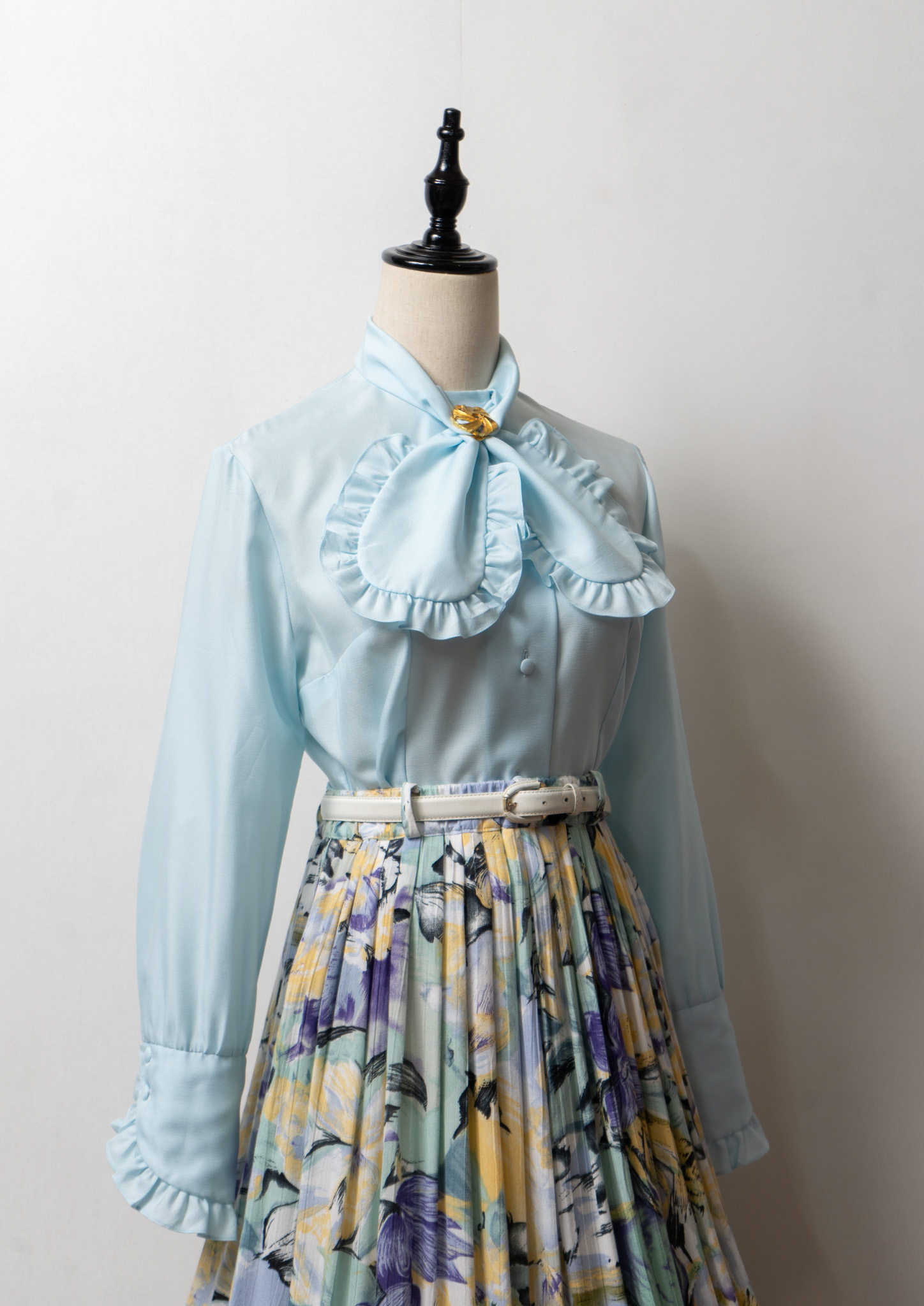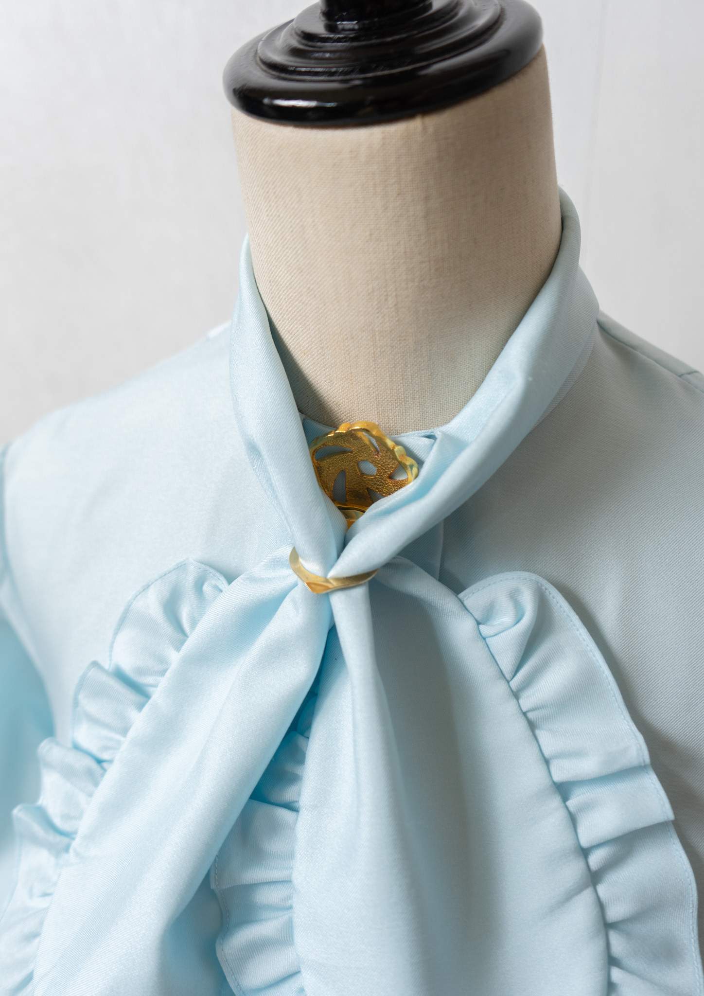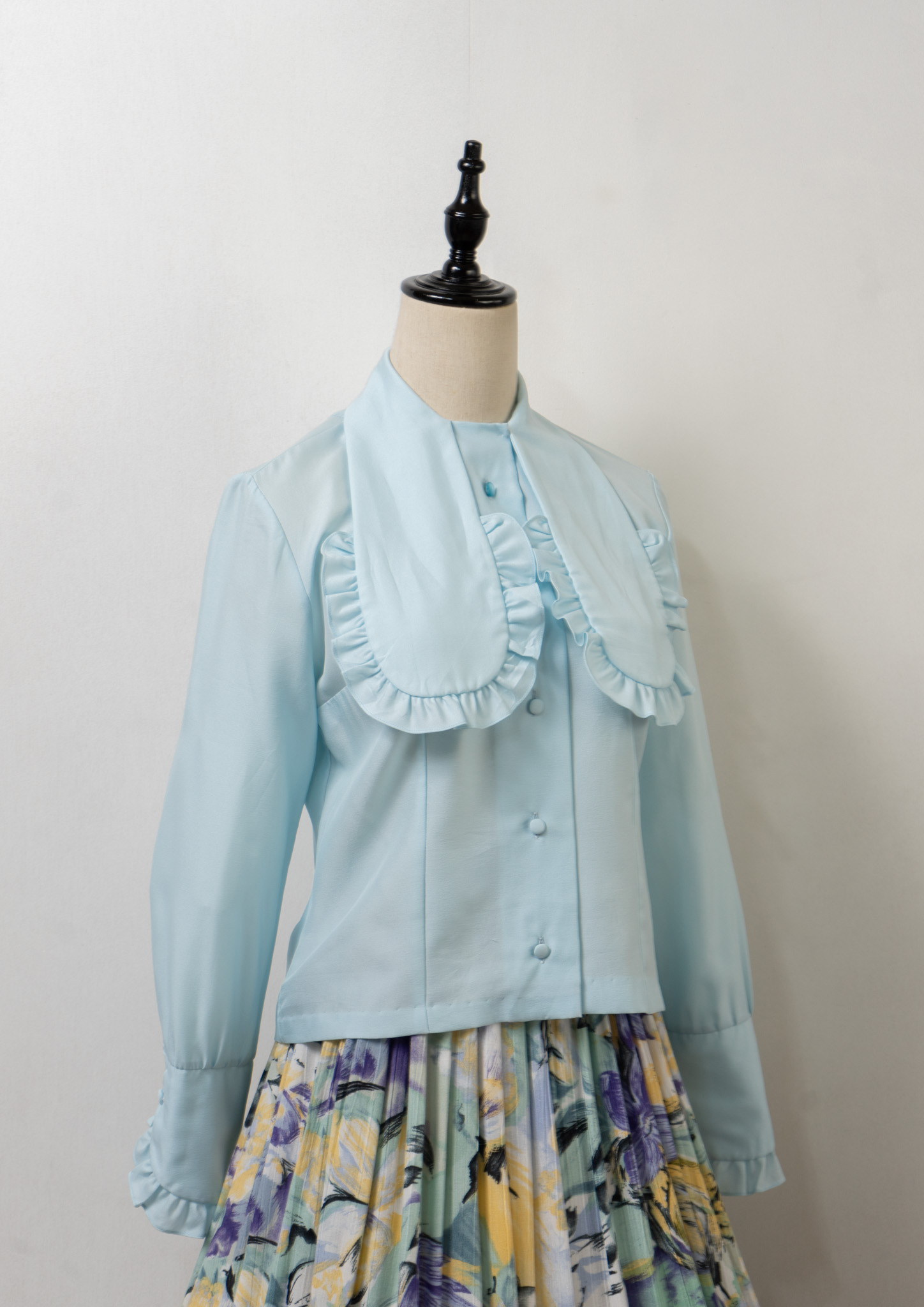 70's Frill Bow-tie Design Light Blue Blouse