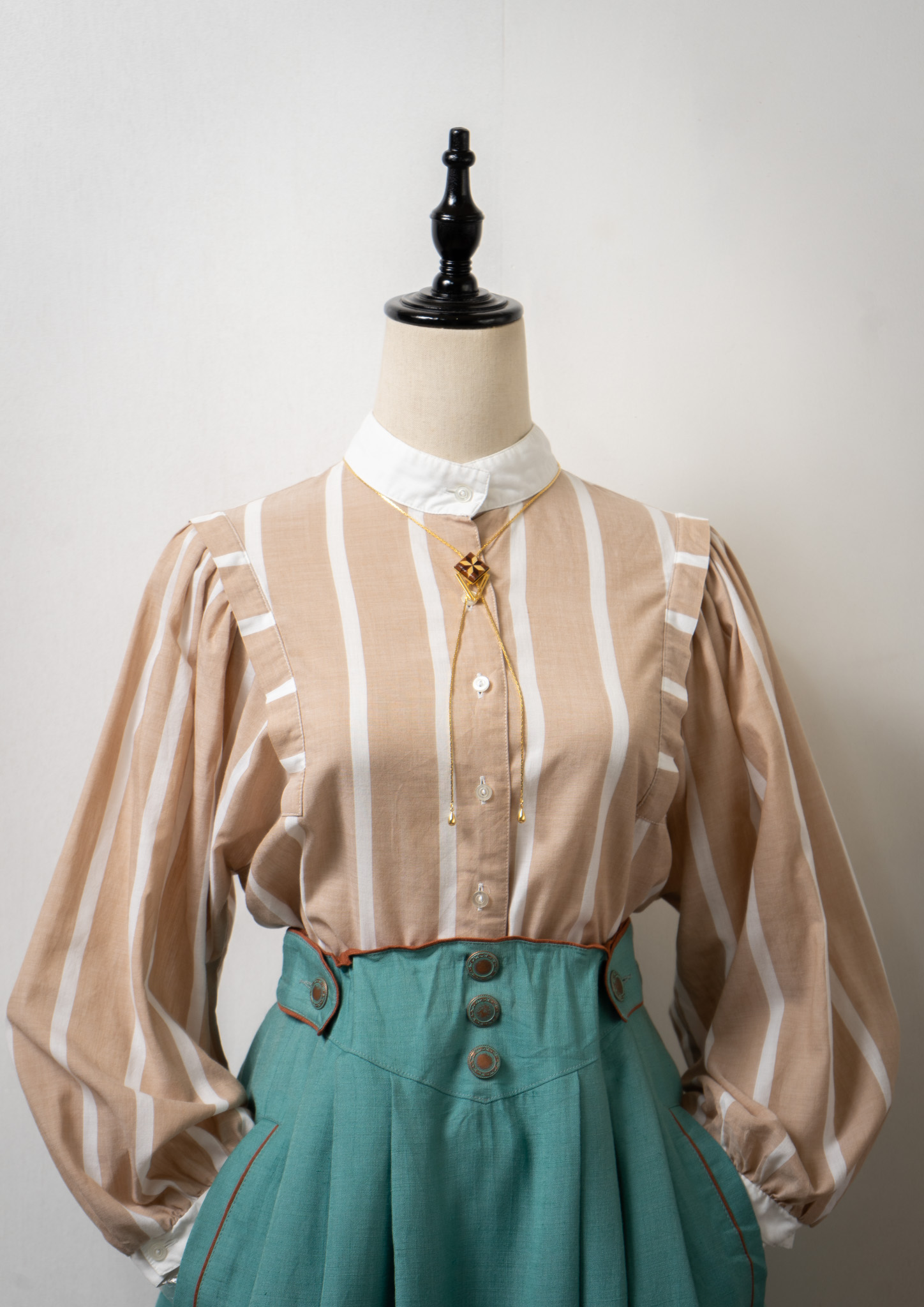 80's Stripe Pattern Stand Neck Beige Blouse