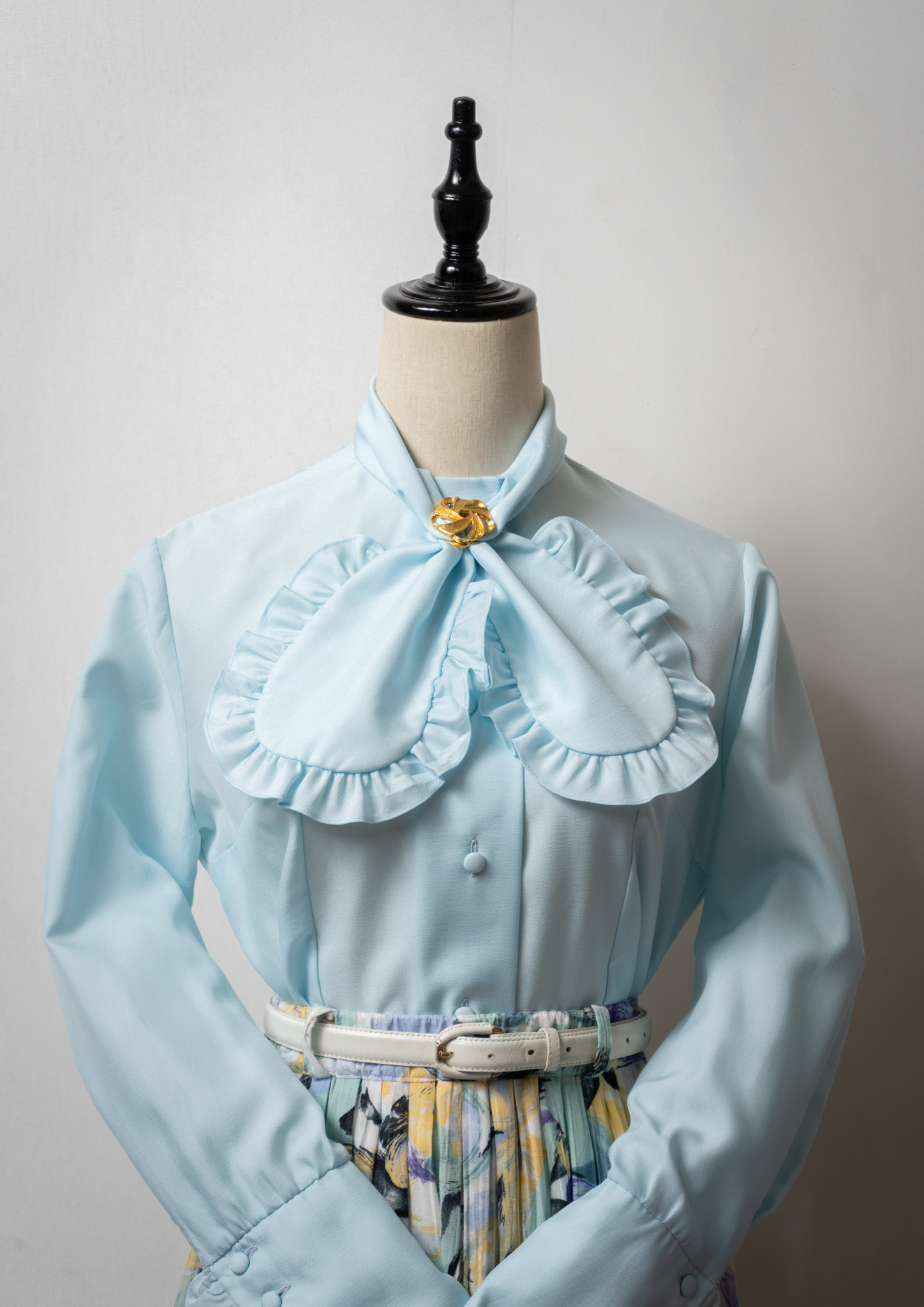 70's Frill Bow-tie Design Light Blue Blouse
