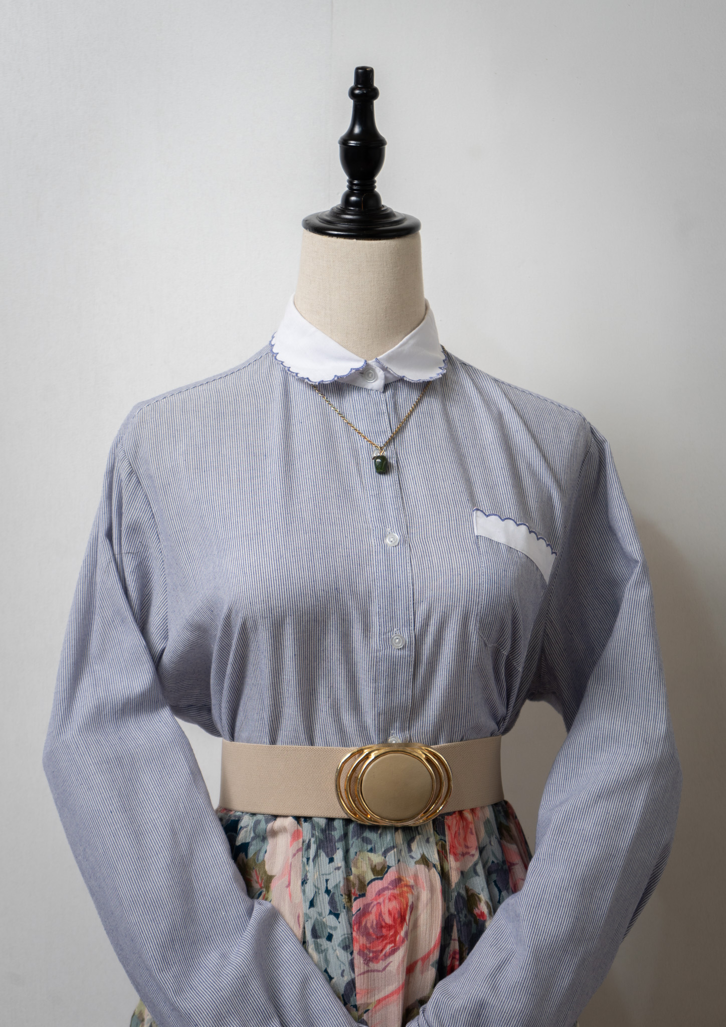 80's Stripe Pattern Point Scallop Design Blouse