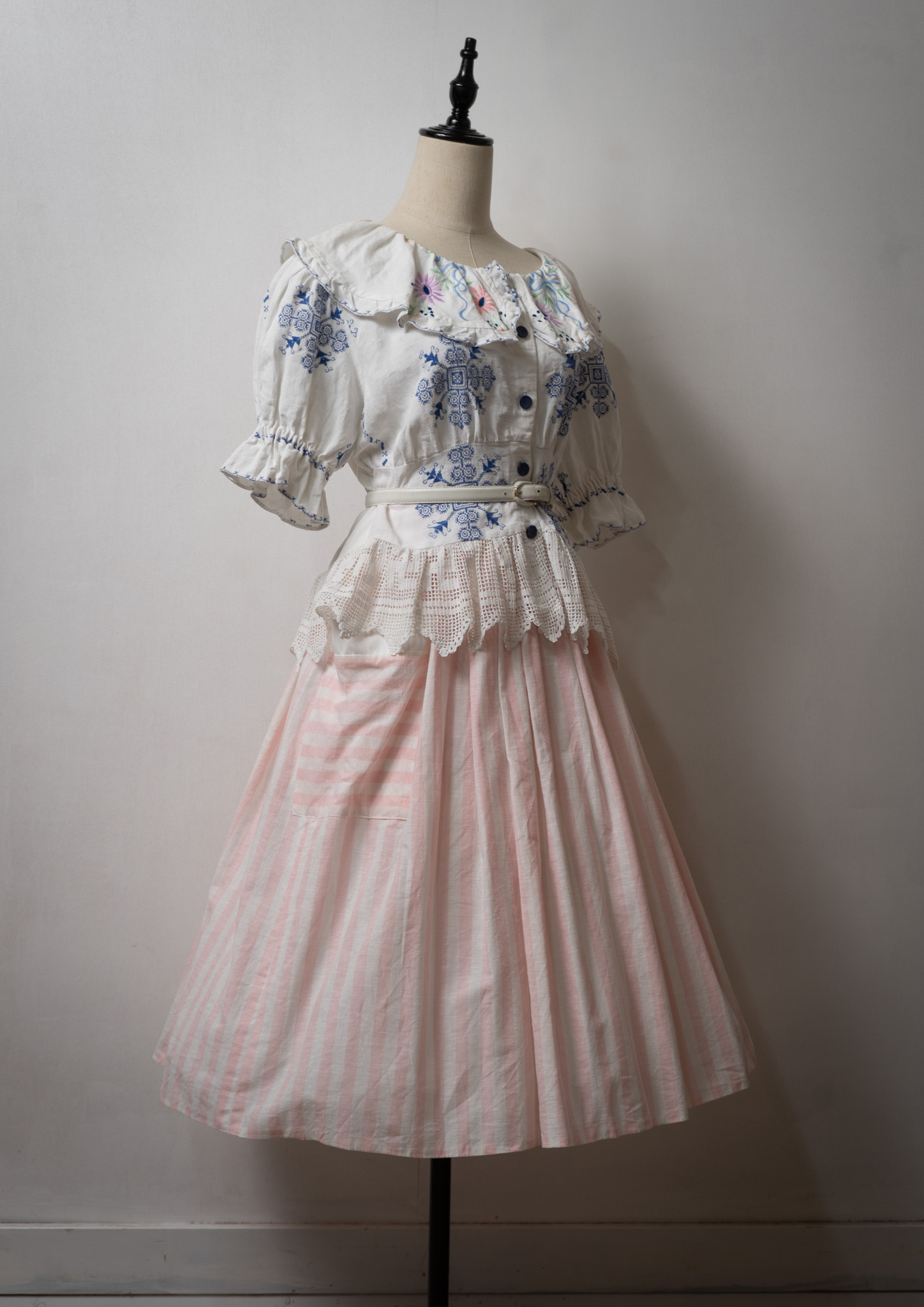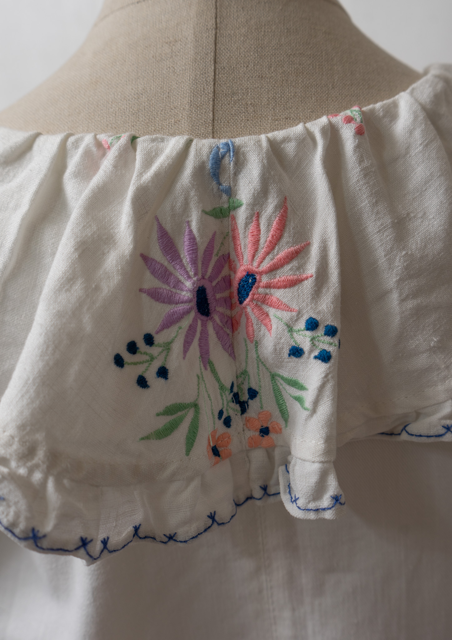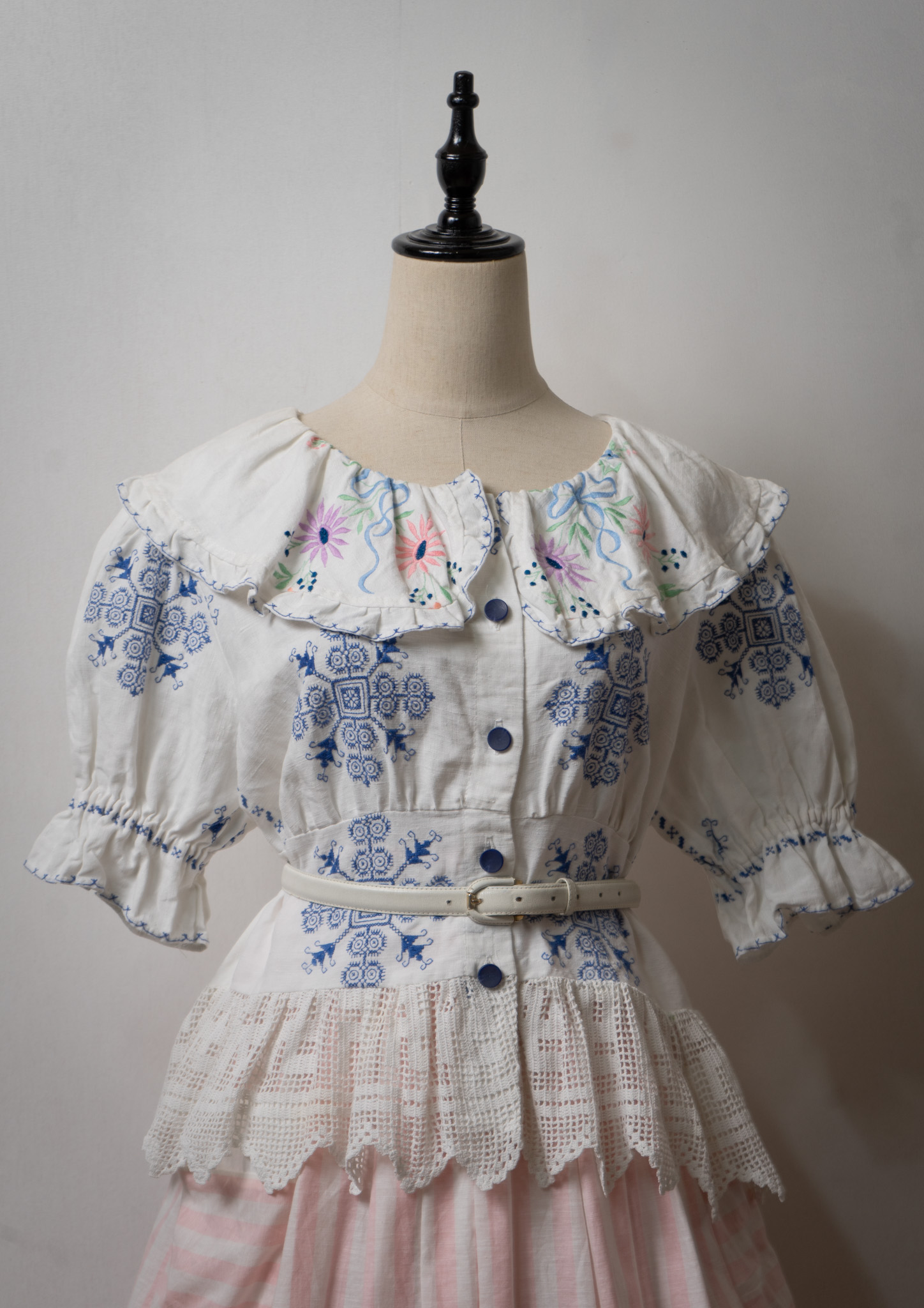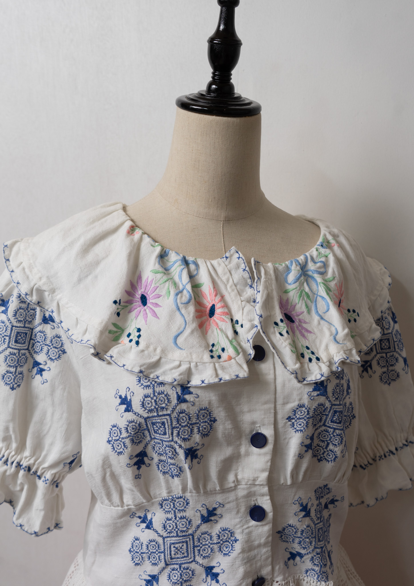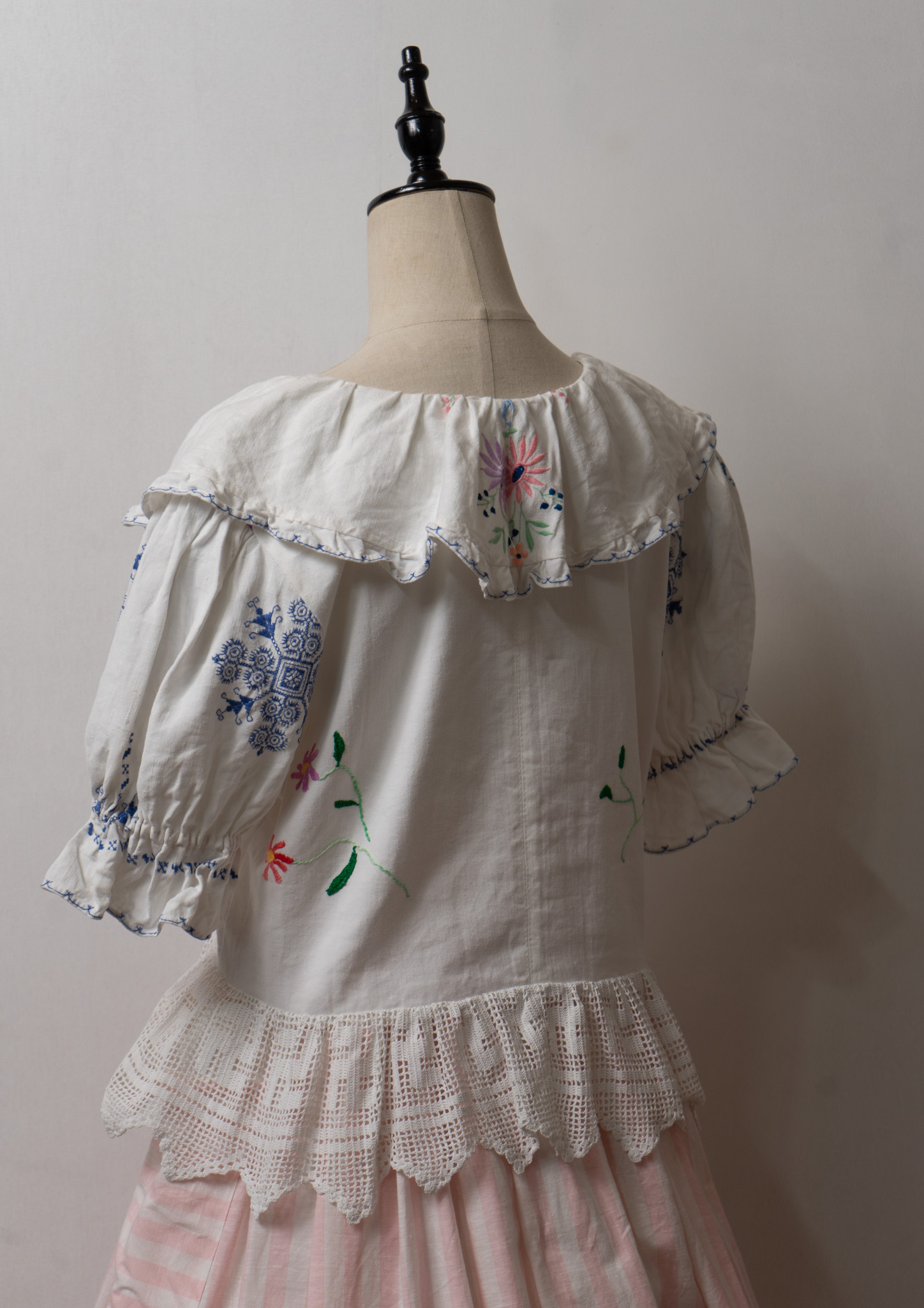 Upcycle Ribbon × Flower Embroidery Big Collar White Blouse