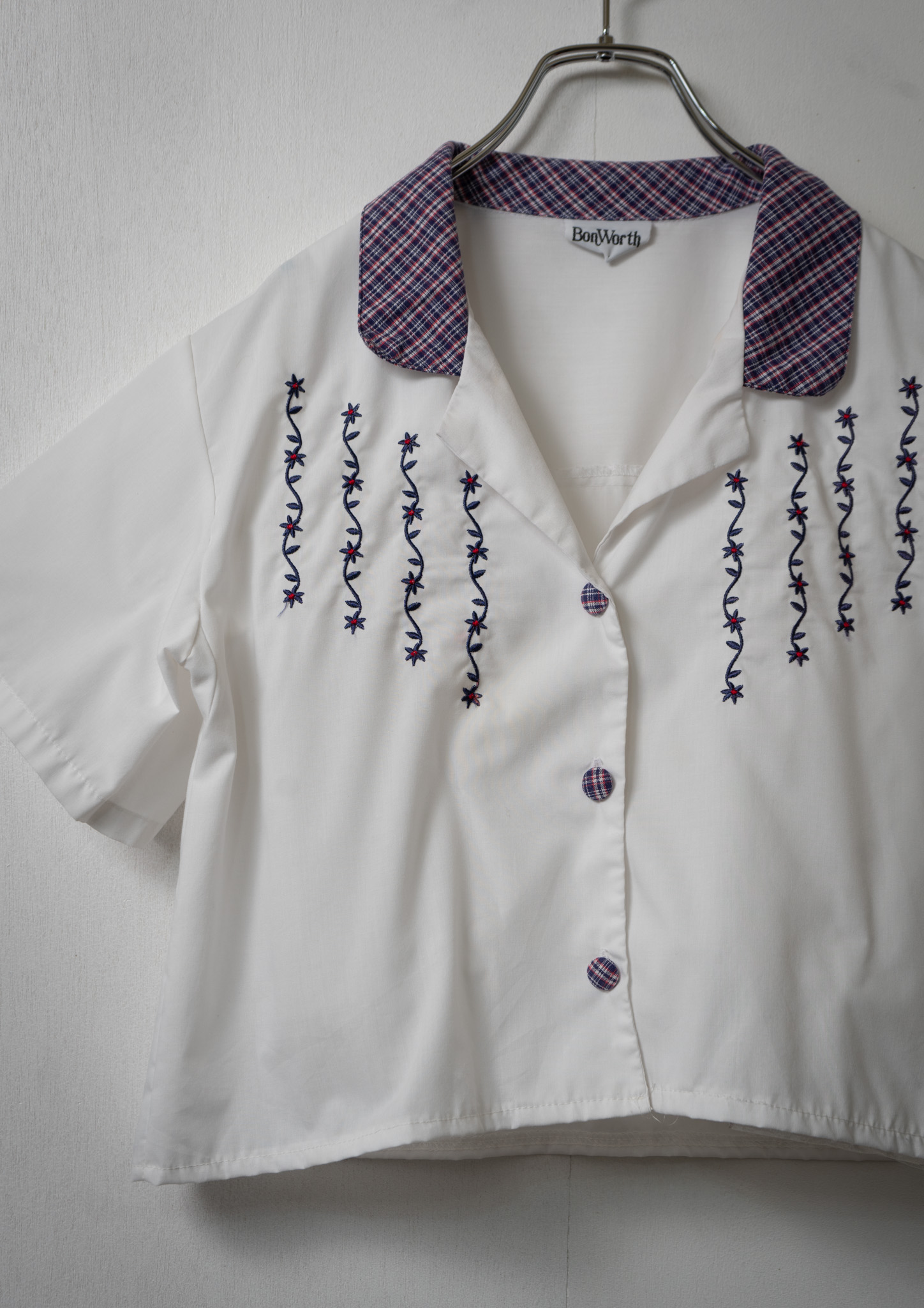 Upcycle Check pattern × Flower Embroidery White Cropped Blouse