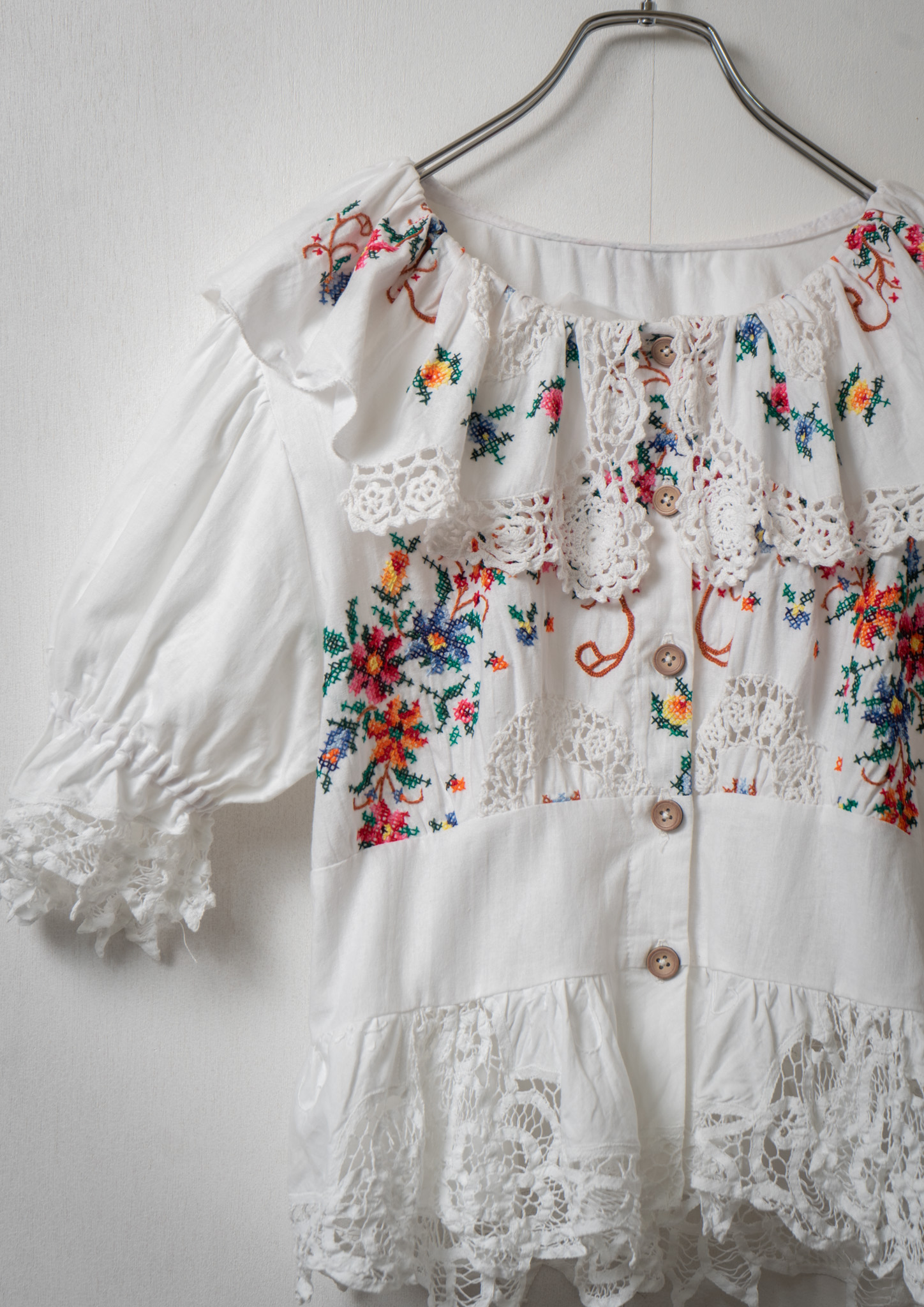 Upcycle Flower Embroidery Crochet Lace White Blouse