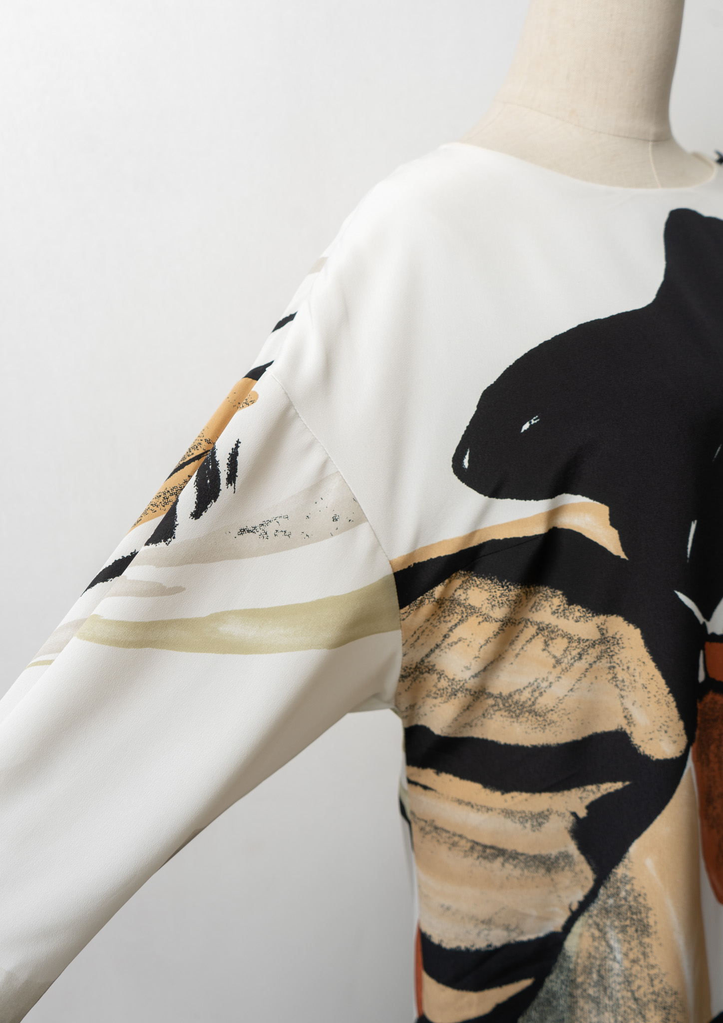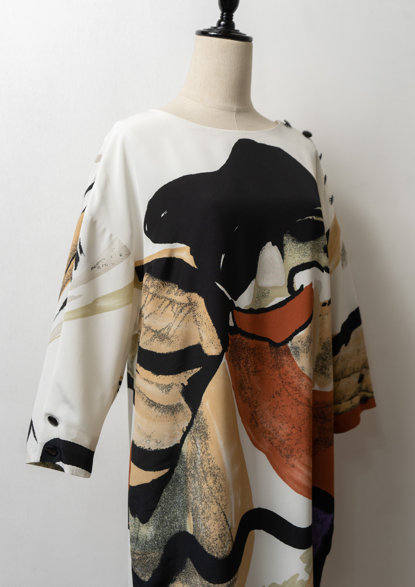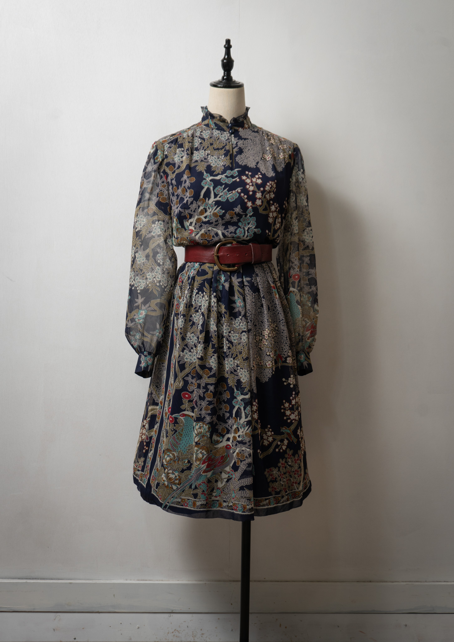 70~80's Bird × Botanical Pattern Stand Neck Dress