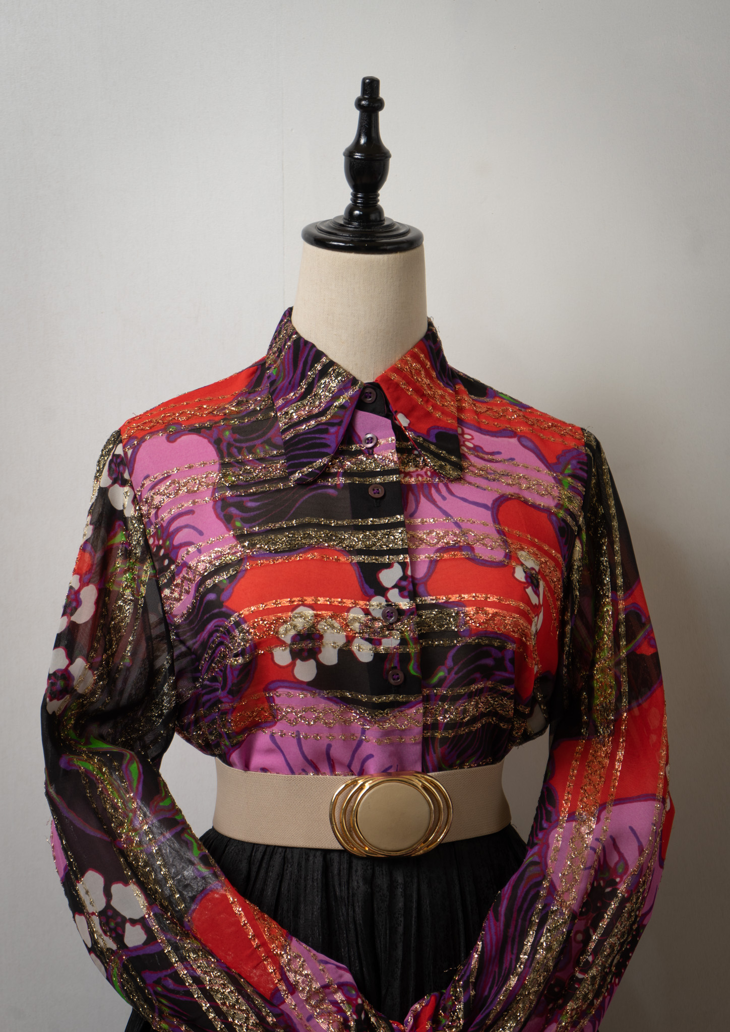 70's Flower Motif Pattern Gold Lame Thread Blouse