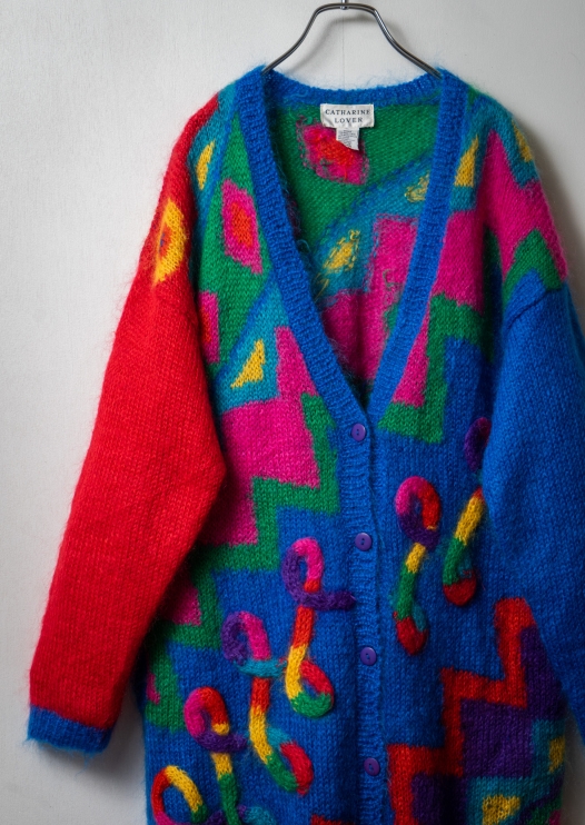 80's Double Pocket Design Unique Pattern Multi Color Mohair Cardigan