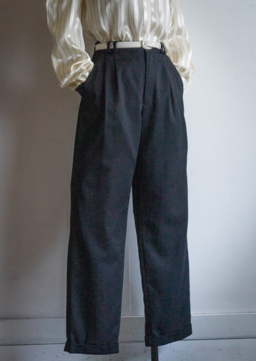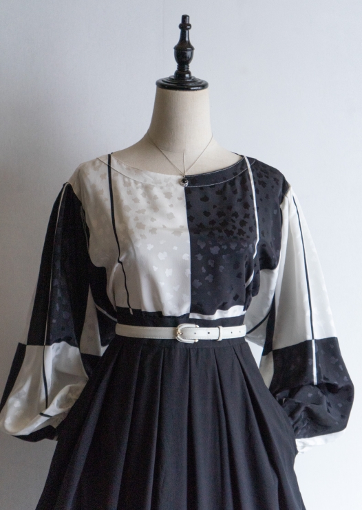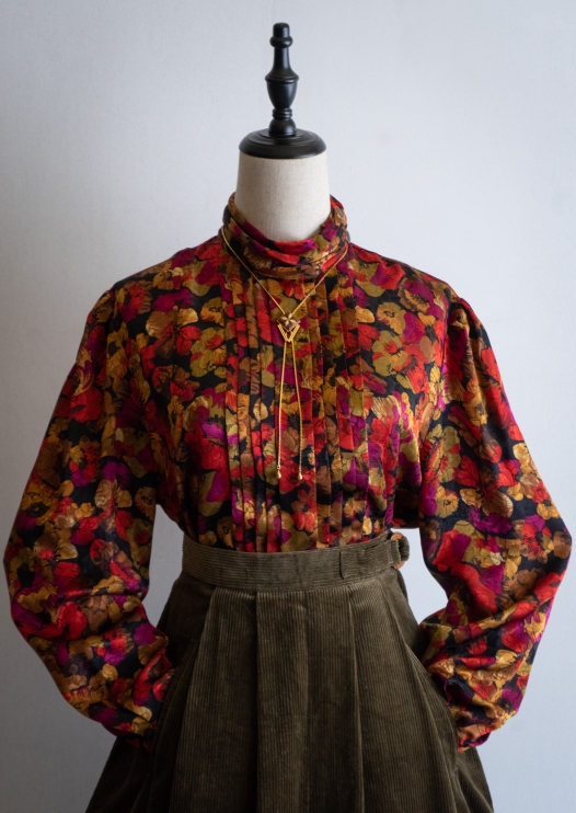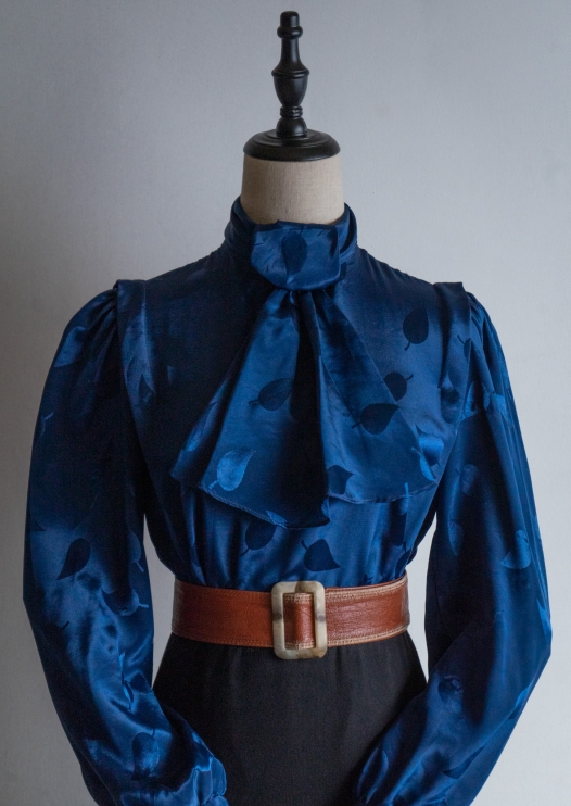 80's Golssy Leaf Pattern Navy Jobot Collar Blouse
