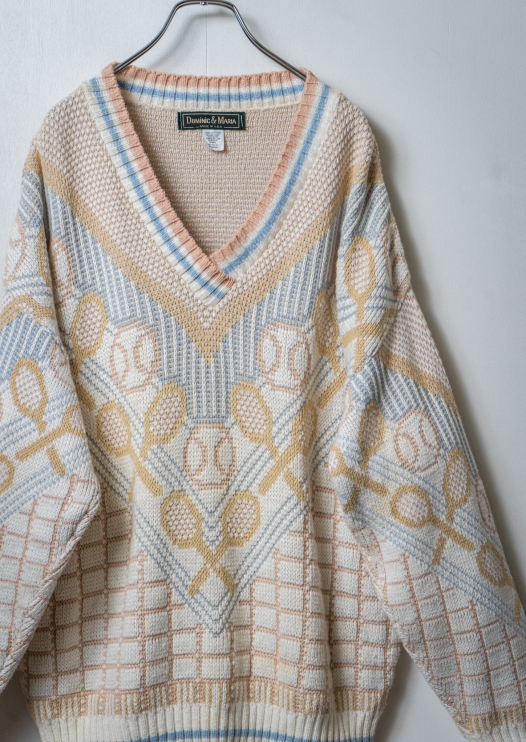 80~90's USA Tennis Art Pattern White Knit Sweater