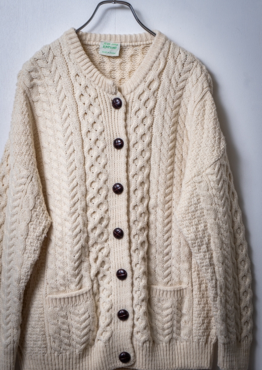 80~90's Ireland Double Pocket Design Off-White Cable Knit Cardigan