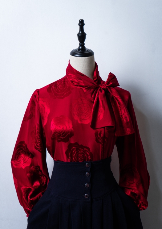 80's Rose Pattern Glossy Red Silk Bow-tie Blouse