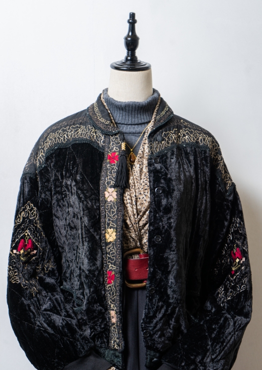 80's Unique Gold Embroidery Design Black Velor Quilting Jacket