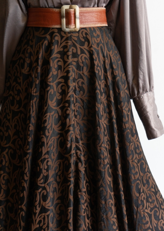 80's Brown Botanical Pattern Black Maxi Skirt