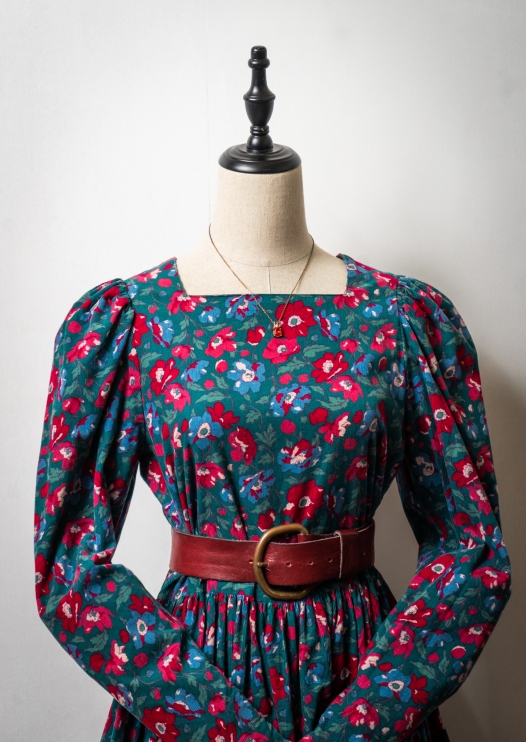 80's UK Laura Ashley Gather Design Flower Pattern Green Corduroy Dress