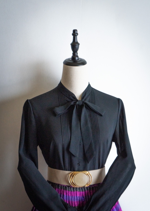 90's Pin Tuck Design Black Sheer Bow-tie Blouse
