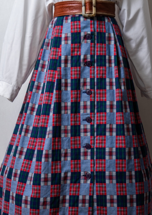 90's Front Button Design Check × Square Patchwork Like Pattern Skirt