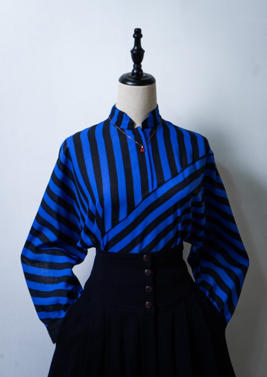 80's Euro Stand Collar Stripe Pattern Blue Sheer Tops