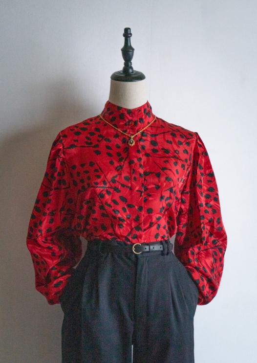 80~90's Euro C&A Black Art Pattern Glossy Red Blouse