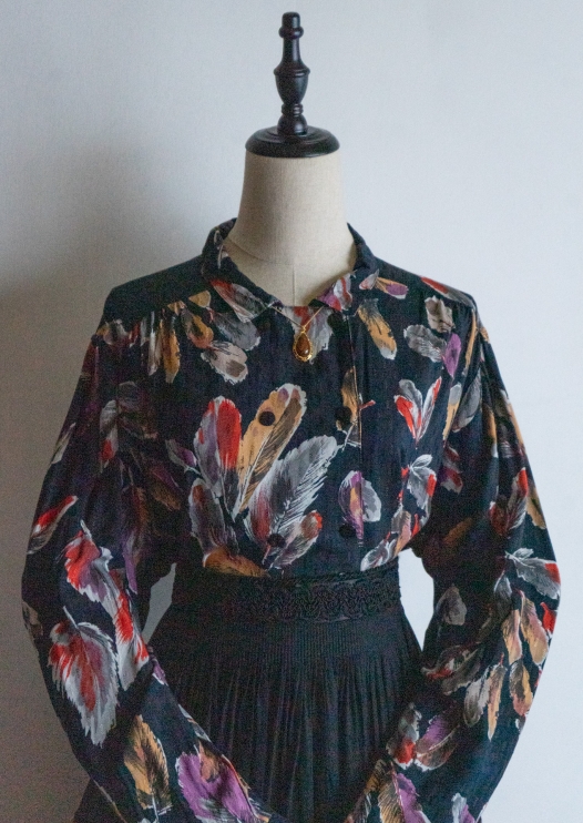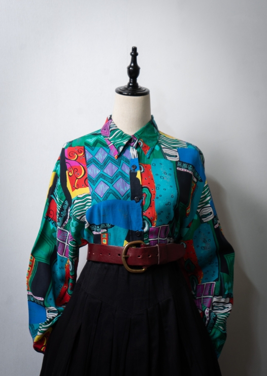 80's Multi Color Art Pattern Tuck Design Black Blouse
