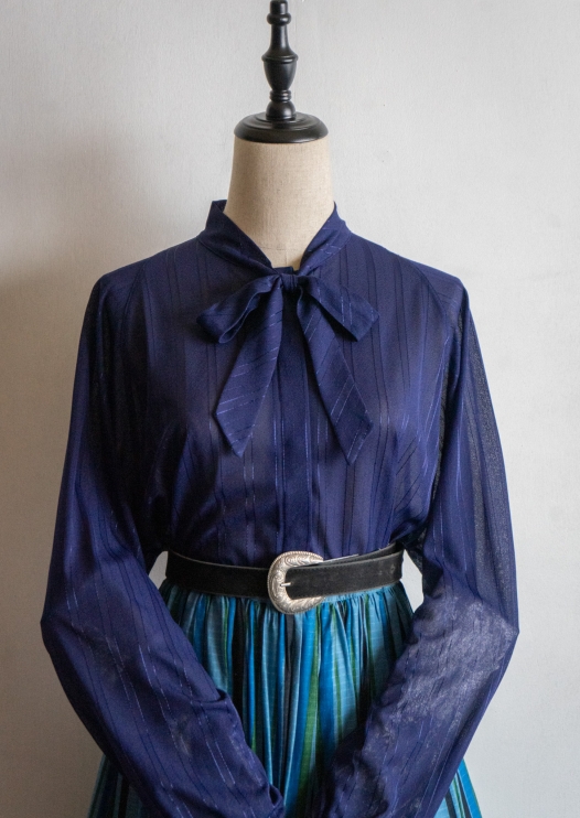 80~90's Euro Stripe Pattern Navy Sheer Bow-tie Blouse